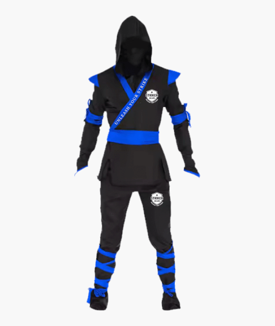 The jacket features gauntlets on the sleeves to cover the hands and forearms, with a hidden shuriken pocket. The head piece comes in two parts (hood and mask) that both have ties.