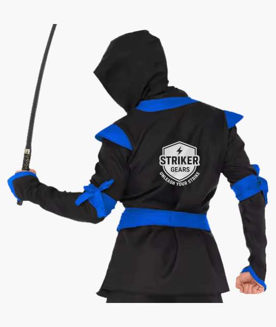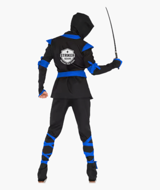 The jacket features gauntlets on the sleeves to cover the hands and forearms, with a hidden shuriken pocket. The head piece comes in two parts (hood and mask) that both have ties.